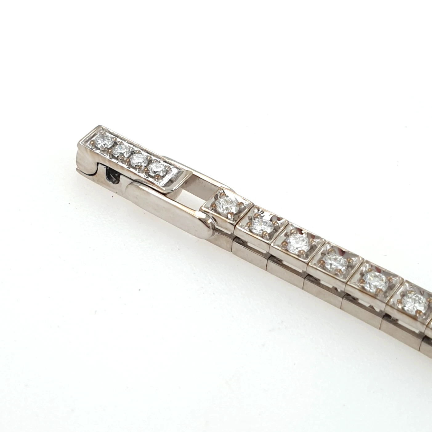 Crafted from 14k white gold, this 1950s features a manual wind movement and a stunning tennis diamond bracelet that artfully combines gold and diamonds.