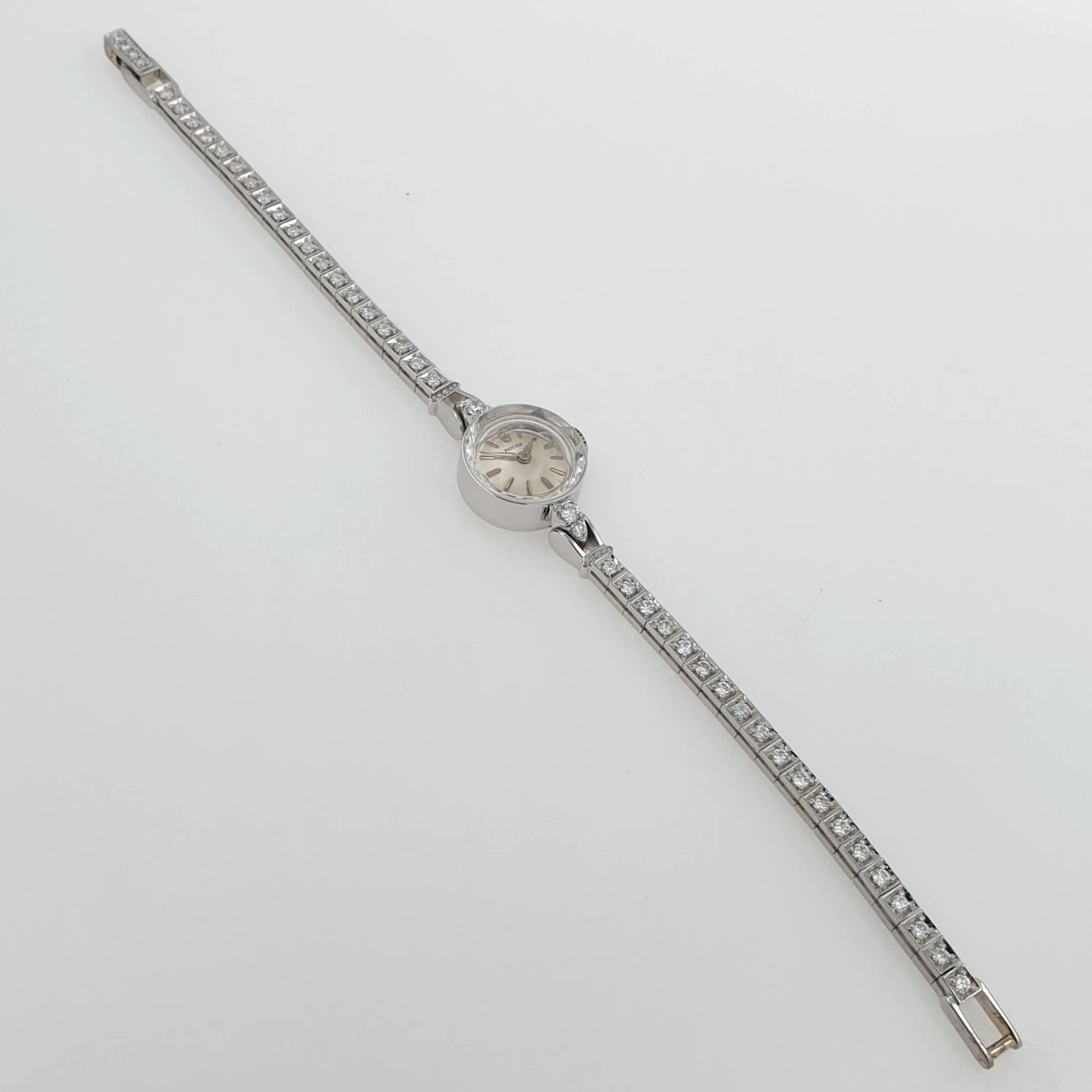 Crafted from 14k white gold, this 1950s features a manual wind movement and a stunning tennis diamond bracelet that artfully combines gold and diamonds.