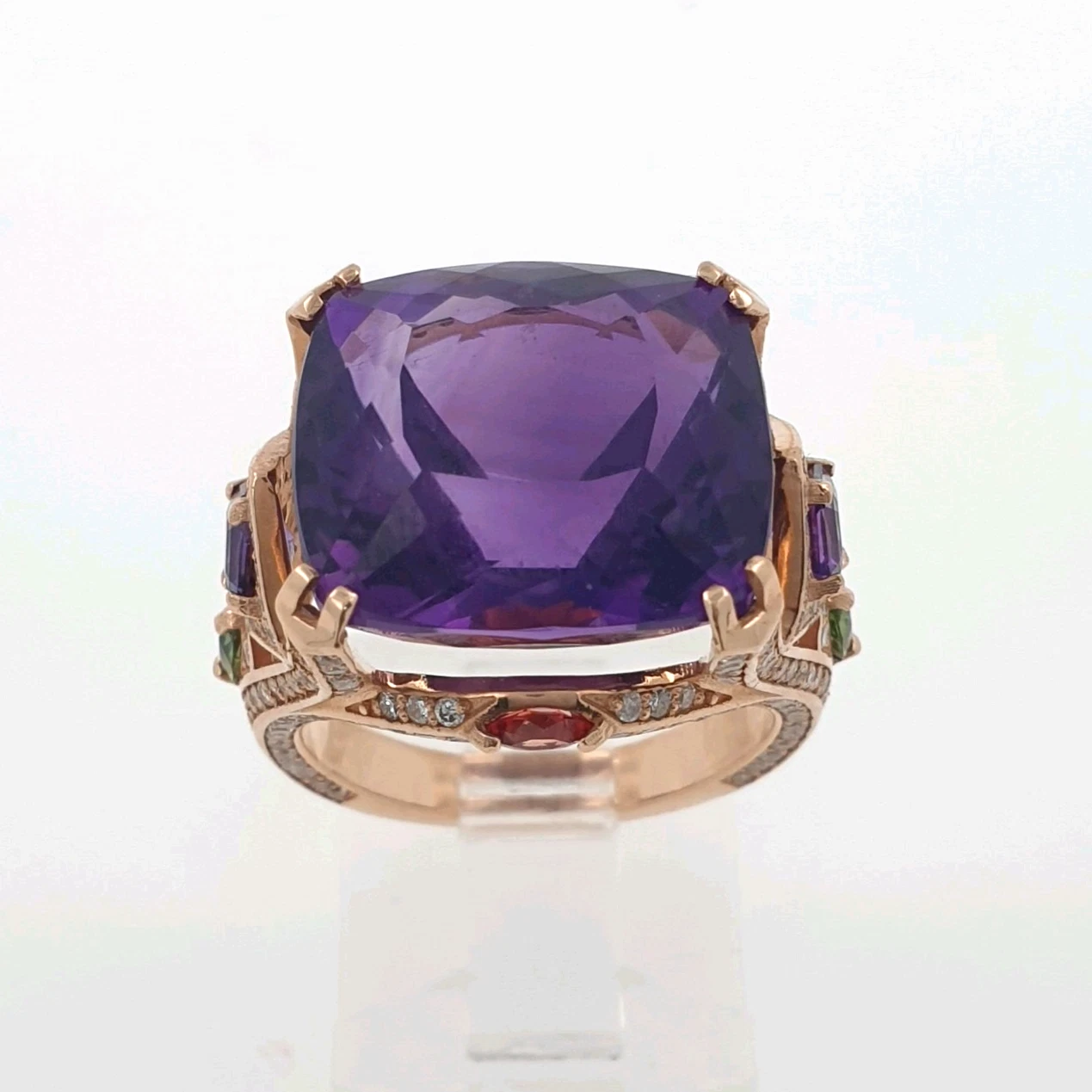 Big 14k rose gold ring with a large amethyst and several natural diamonds on the sides. It is adorned with additional stones, including amethysts, orange sapphires, and turmalins. Perfect cocktail ring with interesting colors and a beautiful design.